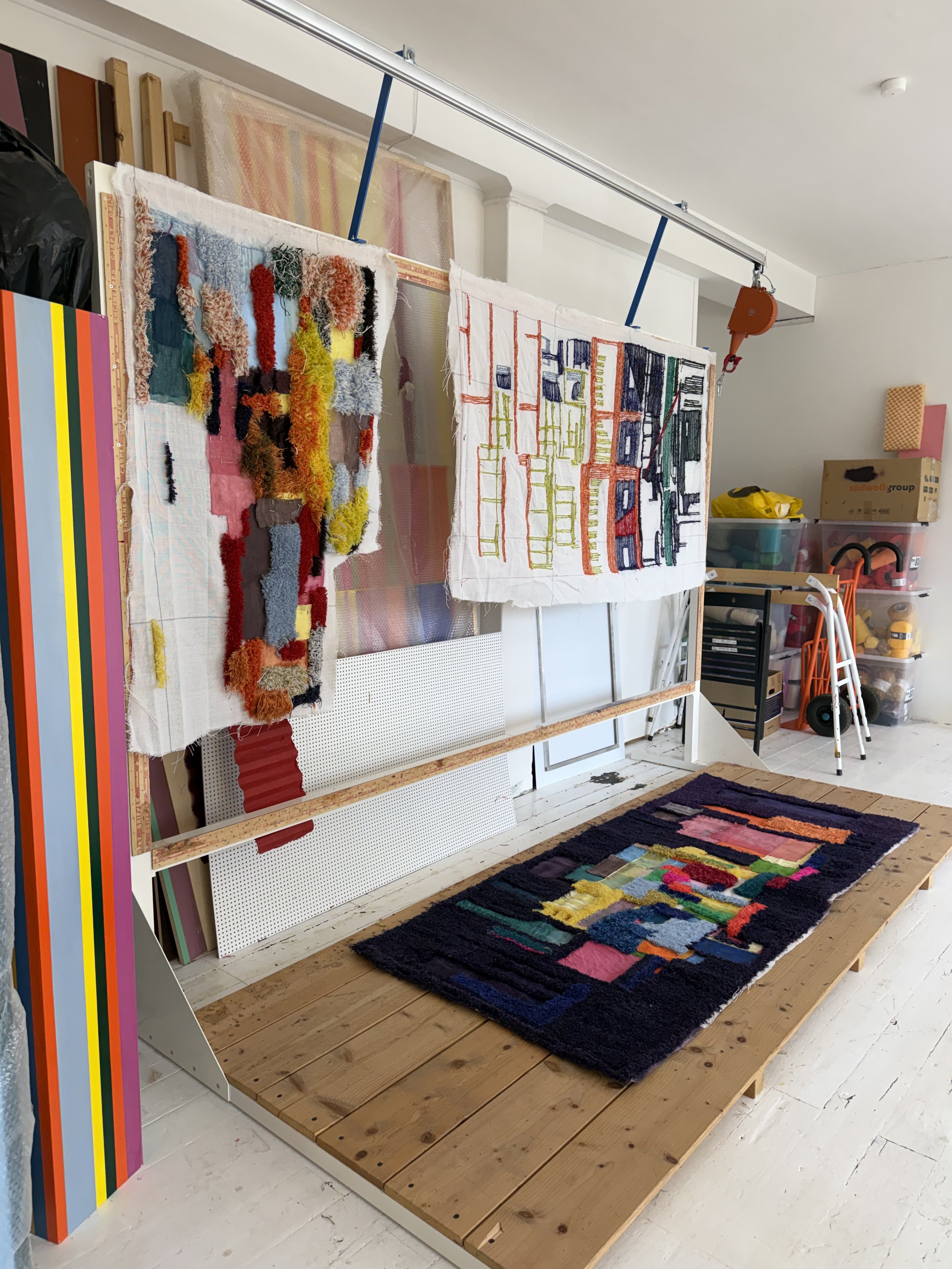 “I asked Artists Little Helper whether it should be the back or the front that faces outward,” she tells me, referring to a tufted work depicting a section of a neighbourhood in New York. Artists Little Helper is a plastic stick, clad with tape, string, and epoxy castings.