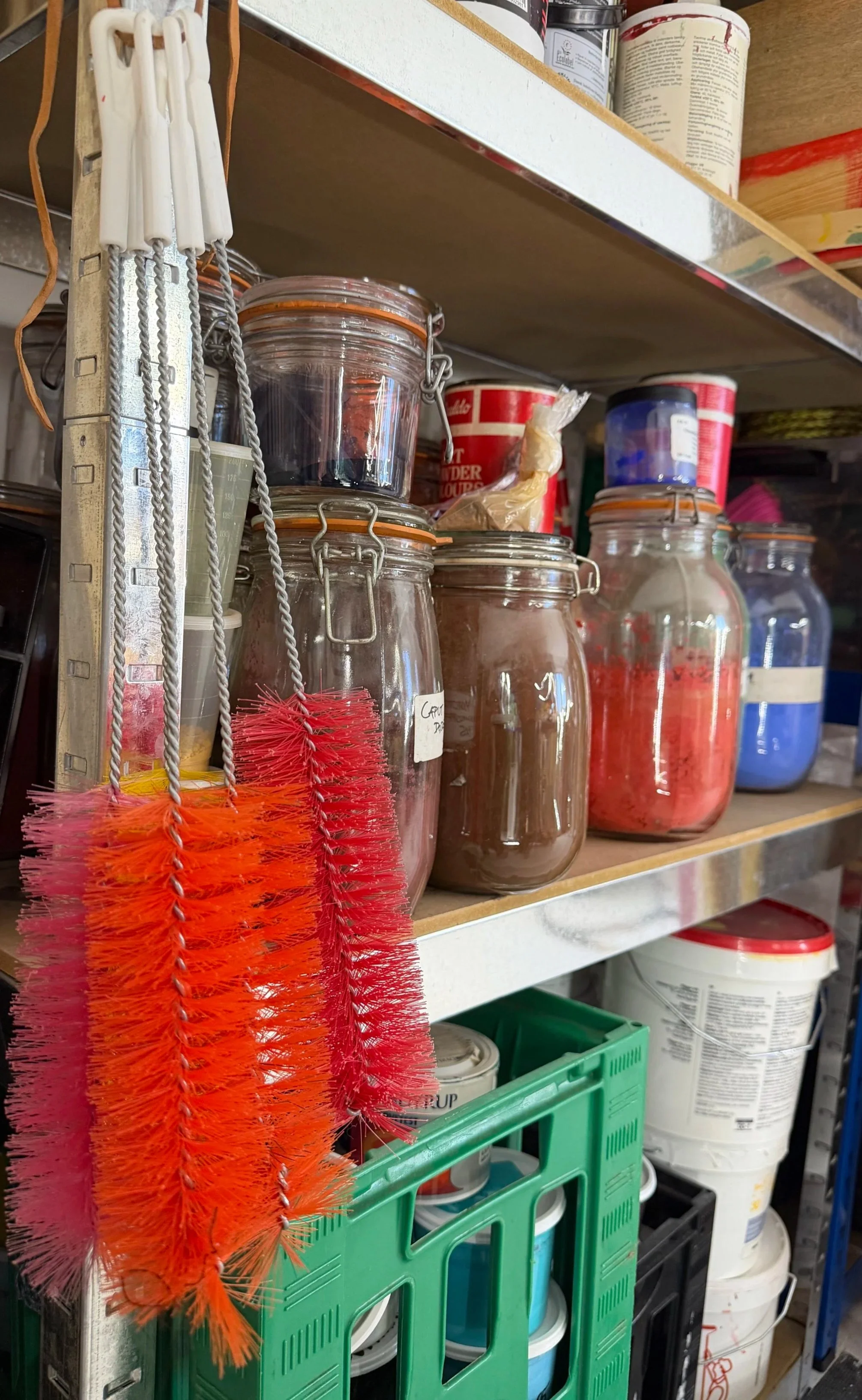 Even when the artist takes her partner on romantic getaways to the city of cities, Paris, her gaze is directed elsewhere than the expected. “Karin was a bit surprised that I brought these home,” Svendsen says, pointing to a handful of brightly coloured bottle brushes hanging in a cluster beside jam jars filled with pigments. “That must be what it’s like to be with an artist,” we agree, laughing loudly. “It comes with the package.”