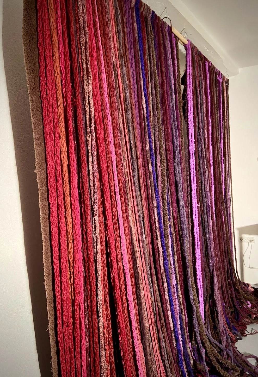 Over coffee, my gaze keeps returning to Ingrid. A monumental finger-knitted work, suspended in long, bodily strands from ceiling to floor, ending in a jumble of patterns, entanglements, and evolutions. Winther created the piece while her mother was terminally ill, sitting by her side for an entire year. “The gross measurement comes to ten kilometers, but it has shrunk in the process”, she notes. “I’ve measured it”.