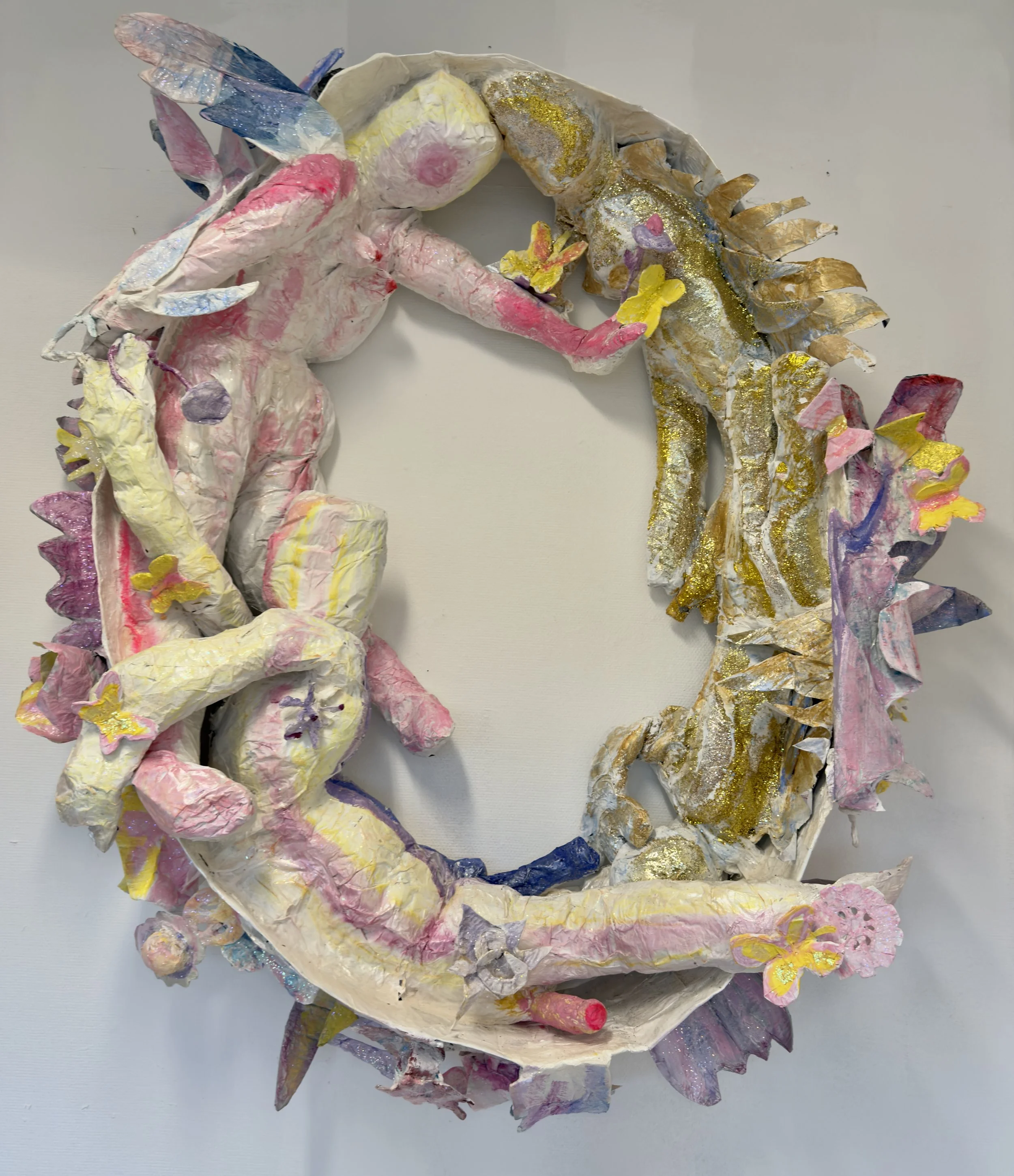 Her expression remains consistently distinctive, a kind of aesthetic symbiosis in which celebration, faith, the body, and the energy of the dance floor coexist. “When I make an angel, it can look like crap”, she says with a smile, “but then I add some glitter and it’s fantastic”. We laugh with relief as we observe the work Sex Angels and Butterflies, and within that laughter lies an acknowledgment of the immediacy of the material and its transformative potential. One moment the work evokes a human spiral dance, a whirlwind, the next, a kind of secret portal with Shangri-La awaiting on the other side. “There is love for everyone,” Menore elaborates.