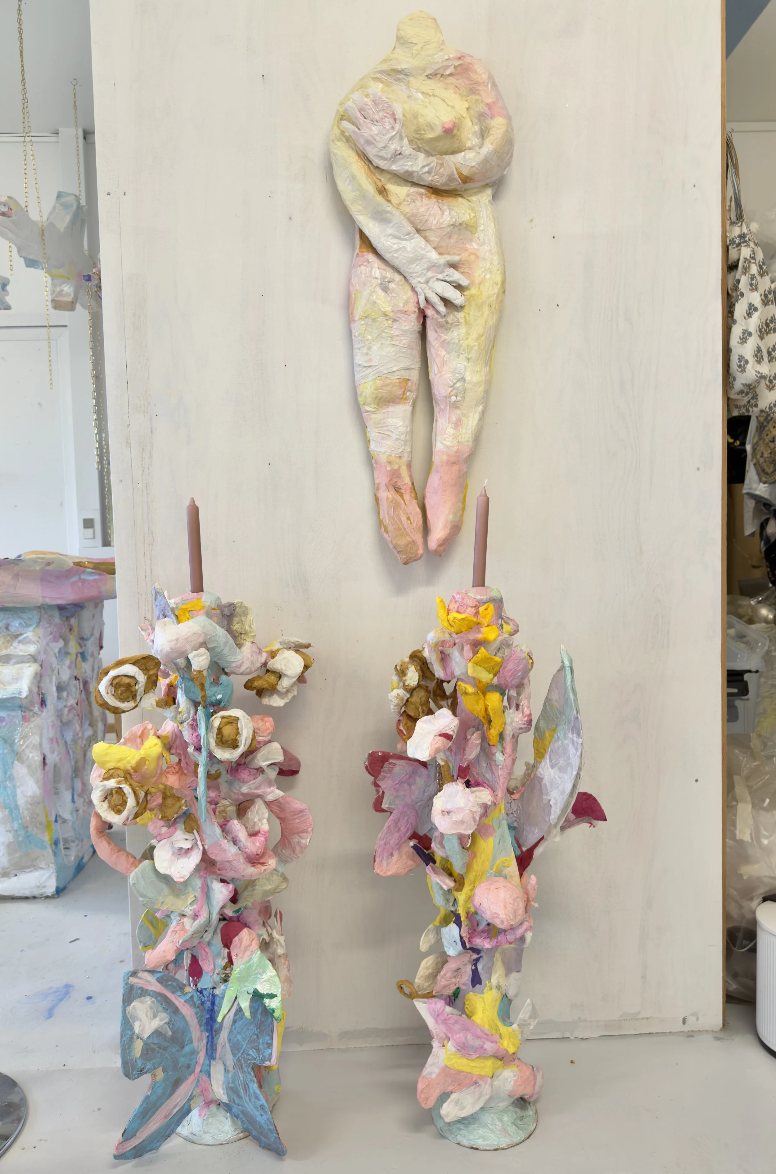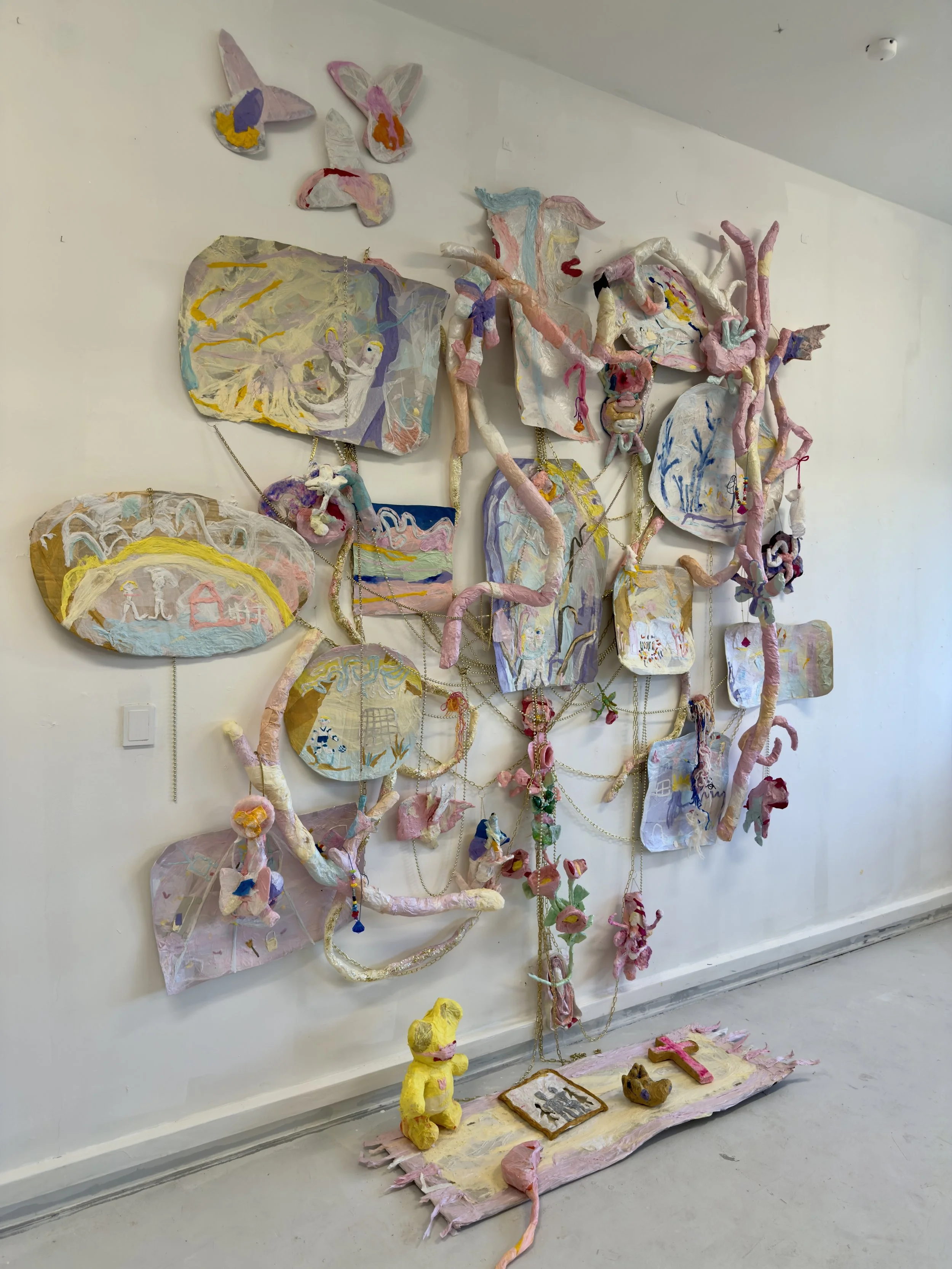 My attention is drawn to the work I wasn’t expecting that: a headless female figure in an embracing posture. “She protects herself while also appearing strong, somewhat like the Virgin Mary,” the artist describes. Faith is constantly present in her practice, yet it is translated into a visual abundance of magical reliefs, monumental candlesticks, rainbows, and explosive colors. Beneath this lies a simple, almost universal realization: we are different, yet we seek the same, the good life, a life without suffering.