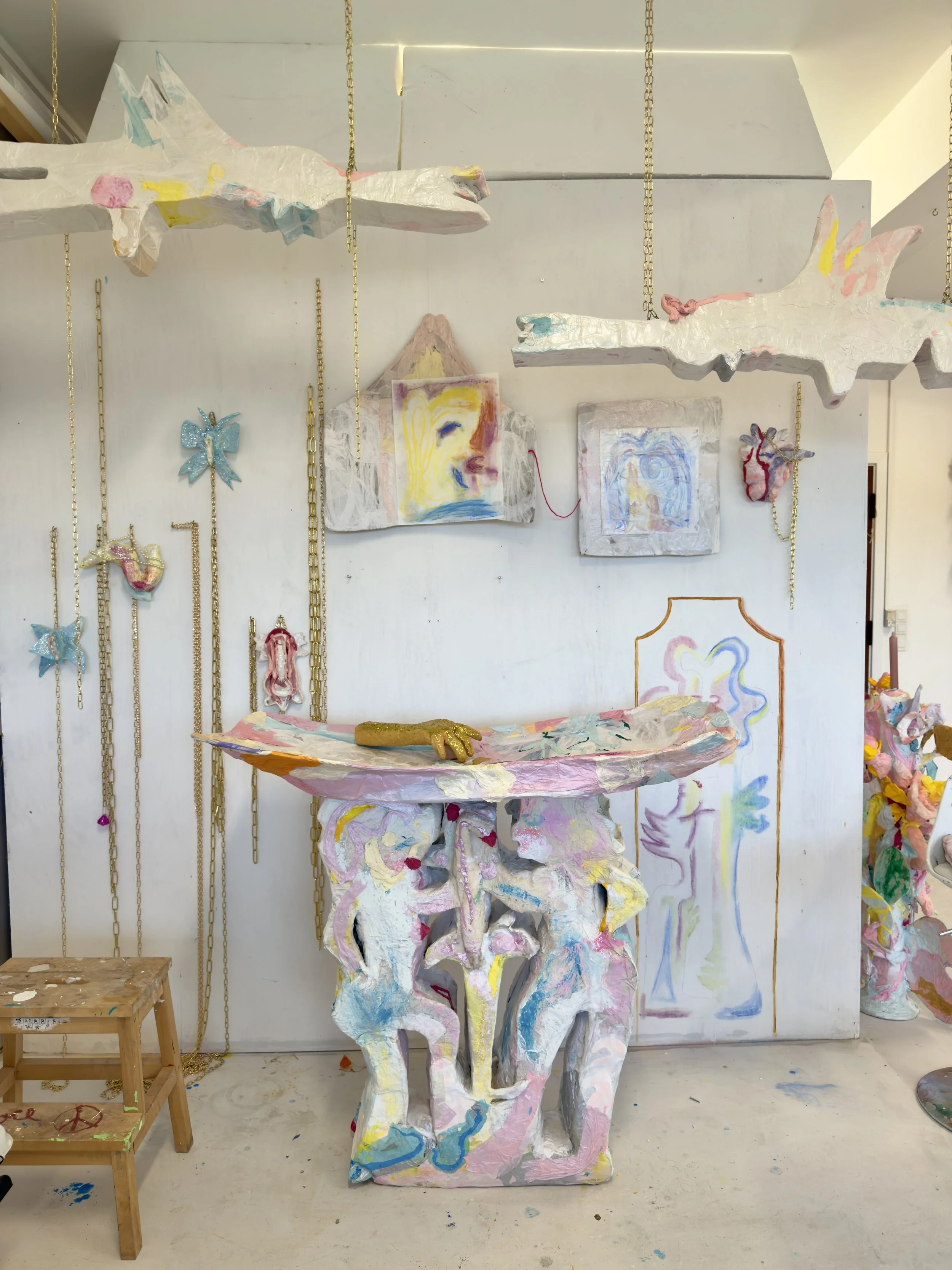 One is tempted to imagine that if Menore were a doctor, she would prescribe dance on prescription. This thought accompanies me as we immerse ourselves in an altar she is currently working on. On the baptismal font rests a hand, covered in gold glitter of course. “It’s my father’s hand,” she clarifies. “My sister and I always held his hand during Sunday mass and played a finger game to pass the time.” Play is a recurring motif, a persistent presence.